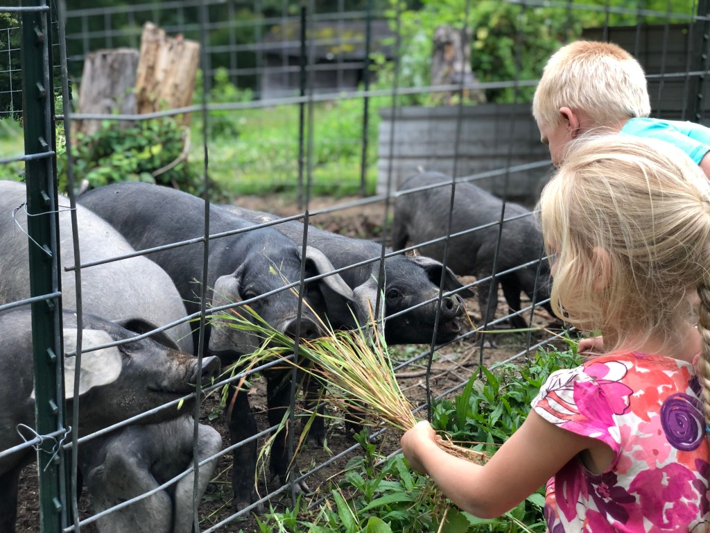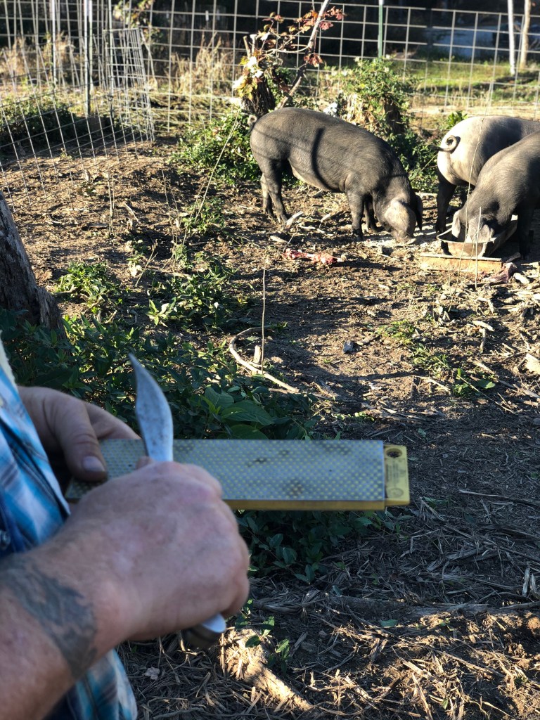 The husband sharpens all the knives, and inspects the meat grinder. He assembles the kettle up where we’ll be doing the scalding, and then pens up the hogs and constructs a temporary pen to separate the one we’ll be eating.