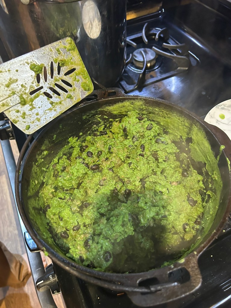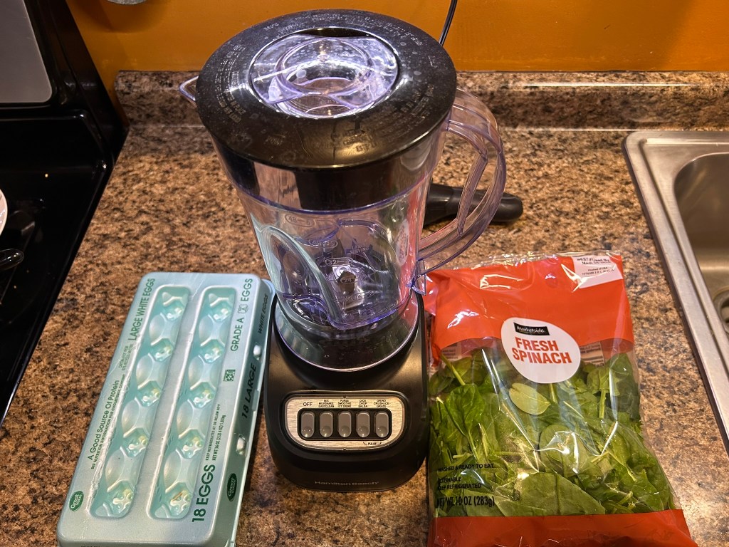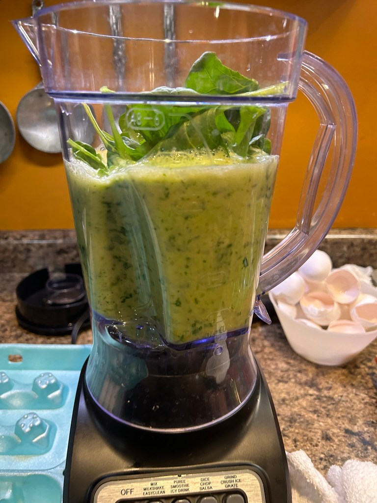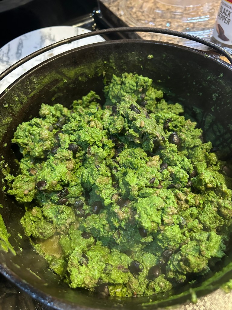 After I turn off the heat and add the black beans to the sausage, I prepare the eggs. I like to cram as much leafy green product in as possible. It will add extra water that comes out of the eggs when they are cooking and I usually strain this off. I start by cracking about a 1/2 dozen eggs into the blender and then a good amount of spinach topped by 6 more eggs. When we have them, we use beet greens that my wife preps up in large batches sauteed with cured smoked pork and seasoning. They are way healthier and tastier than spinach. She freezes them in individual tupperware for later use.