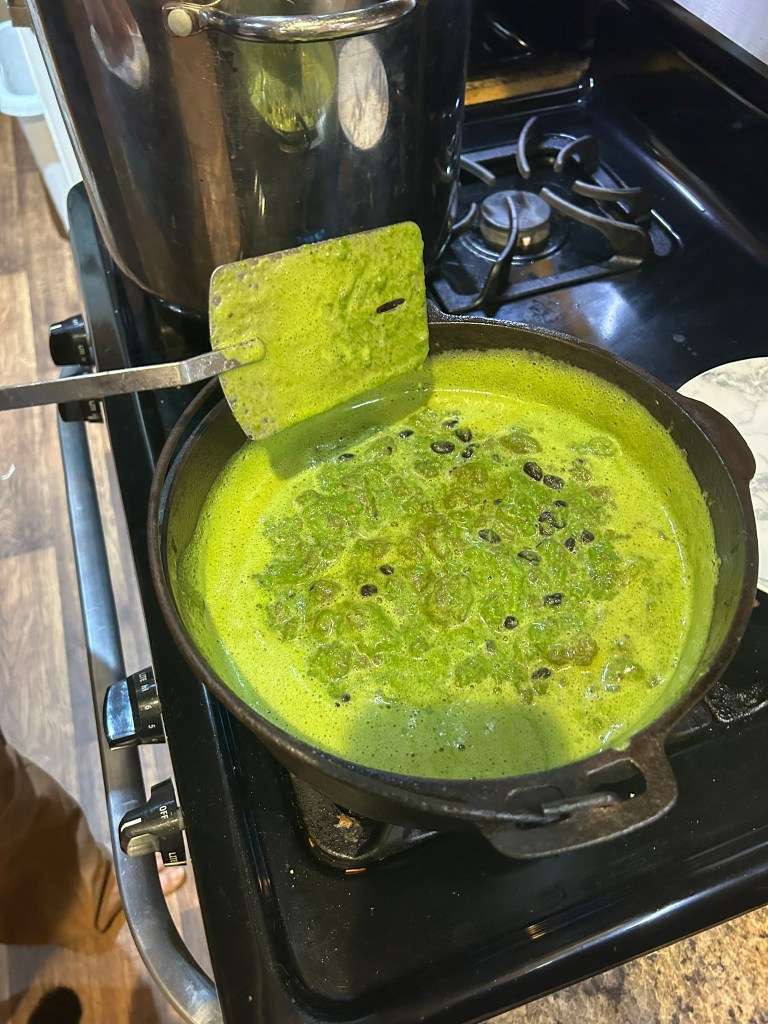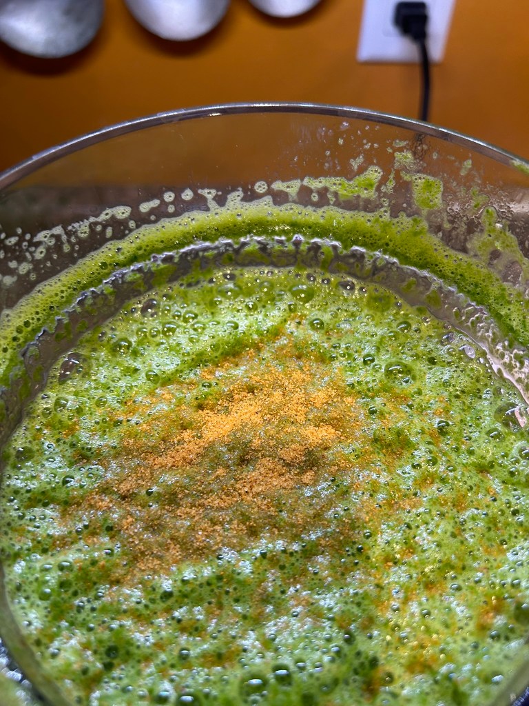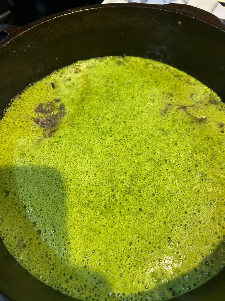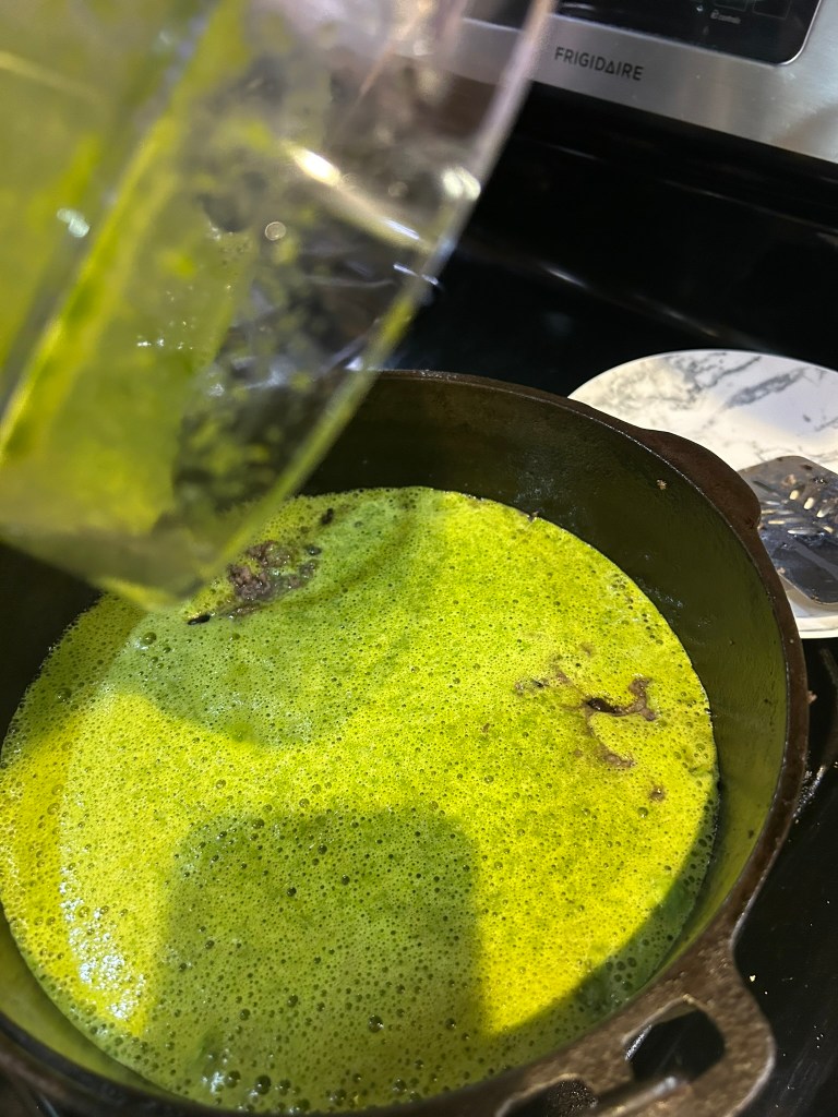 As you can see the puree settles a little while the blender isn’t running. I add the seasoning to the eggs and add the butter to the skillet. Turn the skillet back on and get the butter melted and hot.