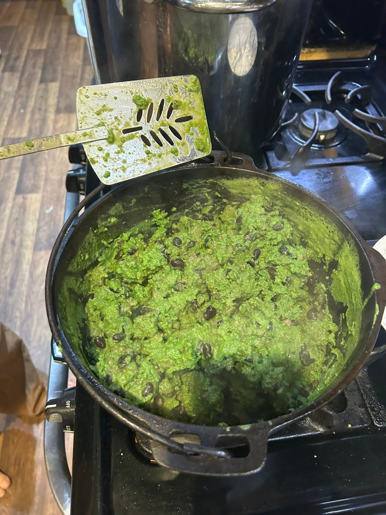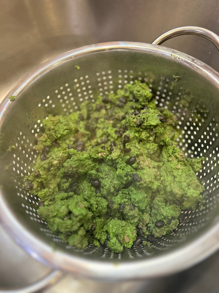 As I am turning and scraping it begins to clump together and I try not to over mix it. You will end up with a greenish liquid in the bottom of your pan from the moisture in the beans and spinach. I strain that off with a colander so it doesn’t make the burritos soggy and drippy.