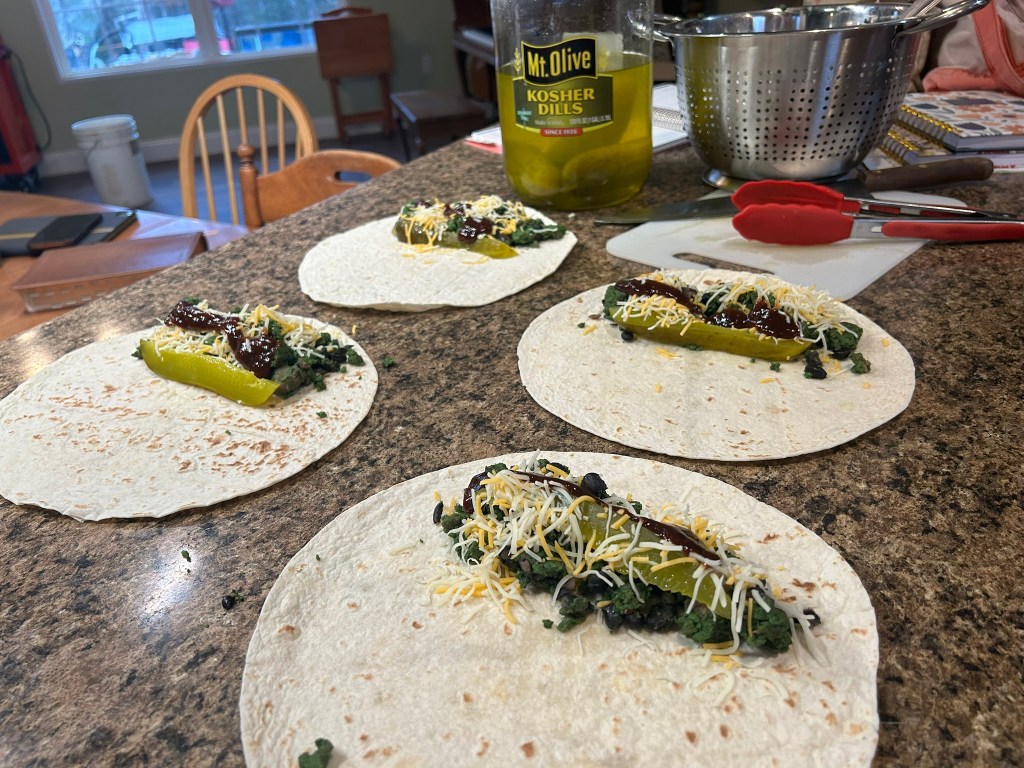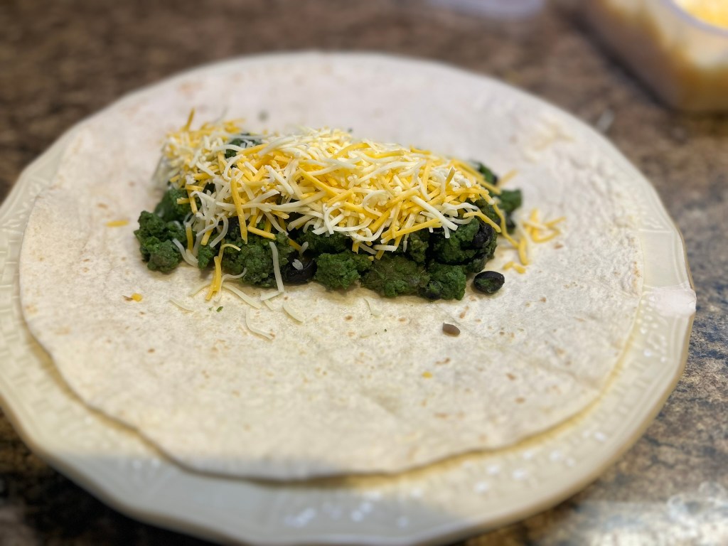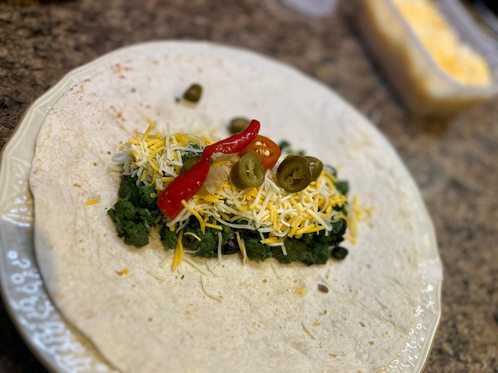 Once the green eggs are cooked it’s time to assemble the burrito. We use large flour burritos. I like to warm my burrito in a dry skillet and then add green eggs, shredded cheese, and jalapenos. After I roll it I love to put it back in the skillet and toast it to perfection. A trick I learned is to use the tongs to roll it for a complete toasting. If you have an air fryer, put the rolled burrito in the air fryer for a couple of minutes and it will come out evenly toasted and crunchy.